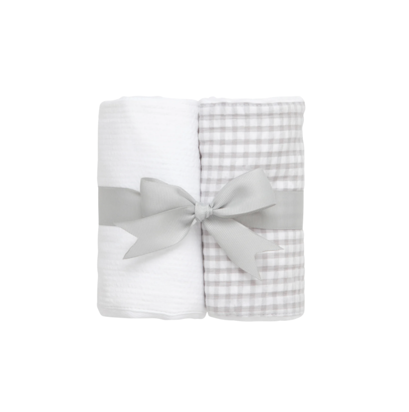 The burp cloths are one of our most practical products! Made from super absorbent, traditional cloth diapers, this set of two burp cloths is always a favorite, featuring beautiful fabrics sewn down the center of each burp. The set is presented beautifully rolled and tied with grosgrain ribbon - ready for gift giving with no extra wrapping required!