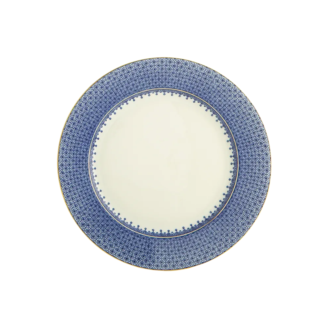 The Blue Lace dessert plate can be used with many patterns. Highlighted by bands of 22k gold, this elegant design offers both the feel of elaborate decorative detail while also being perceived as a solid design. It coordinates beautifully with other services.