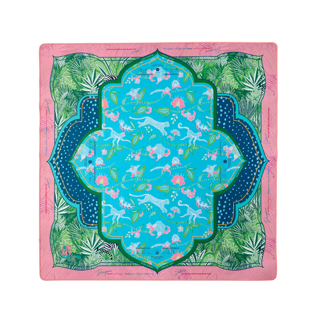 Go wild for the Serengeti Mat, a stunning collaboration with Fort Worth-based fashion designer Sheridan French. Inspired by the jungle's playful spirit and rich beauty, this mat features a lush palette of aqua, coral, and tropical greens, brought to life with cheeky monkeys, striped zebras, and vivid jungle foliage. Designed to pair beautifully with the Glow Wild Tiles (but versatile enough to match many of our sets), the Serengeti Mat brings a sense of adventure, color, and charm to every game.