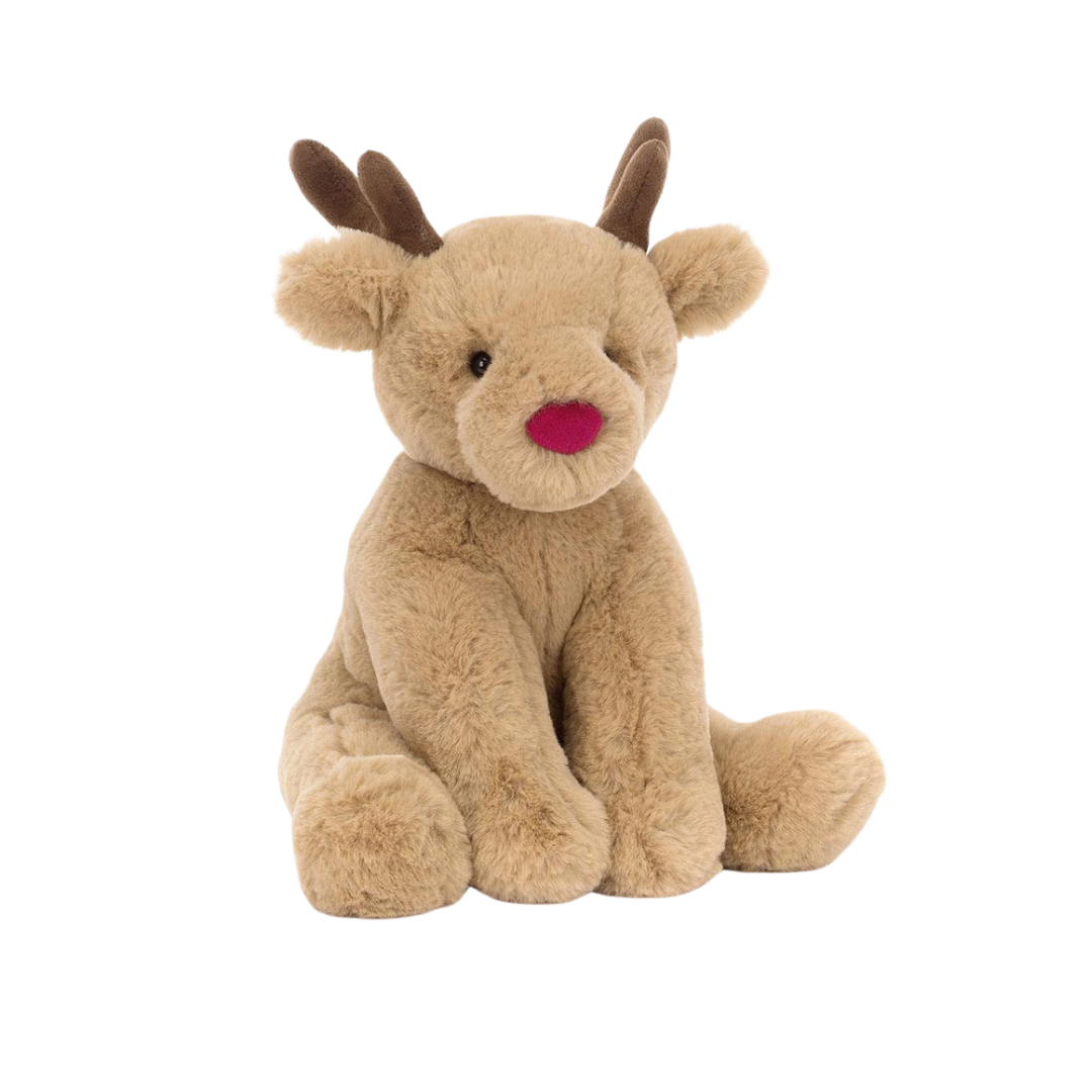 Romi Reindeer brings sleigh-loads of festive joy. This scrumptious honey deer has huge weighted paws and suedette antlers in rich cocoa tones – not to mention their delicate tufty tail, cranberry nose and waggle ears. A Christmas companion for long drives and post-dinner naps.