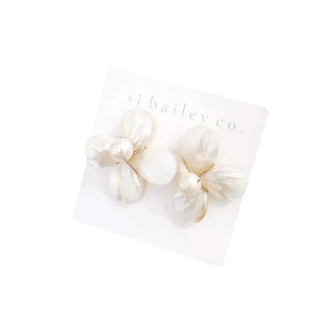 Make a statement with our Windsor Mother of Pearl Earrings, an elegant, elongated version of the classic Katherine design. Featuring lustrous mother of pearl petals with a pearl center, these earrings offer a more dramatic yet lightweight option for those seeking timeless sophistication.